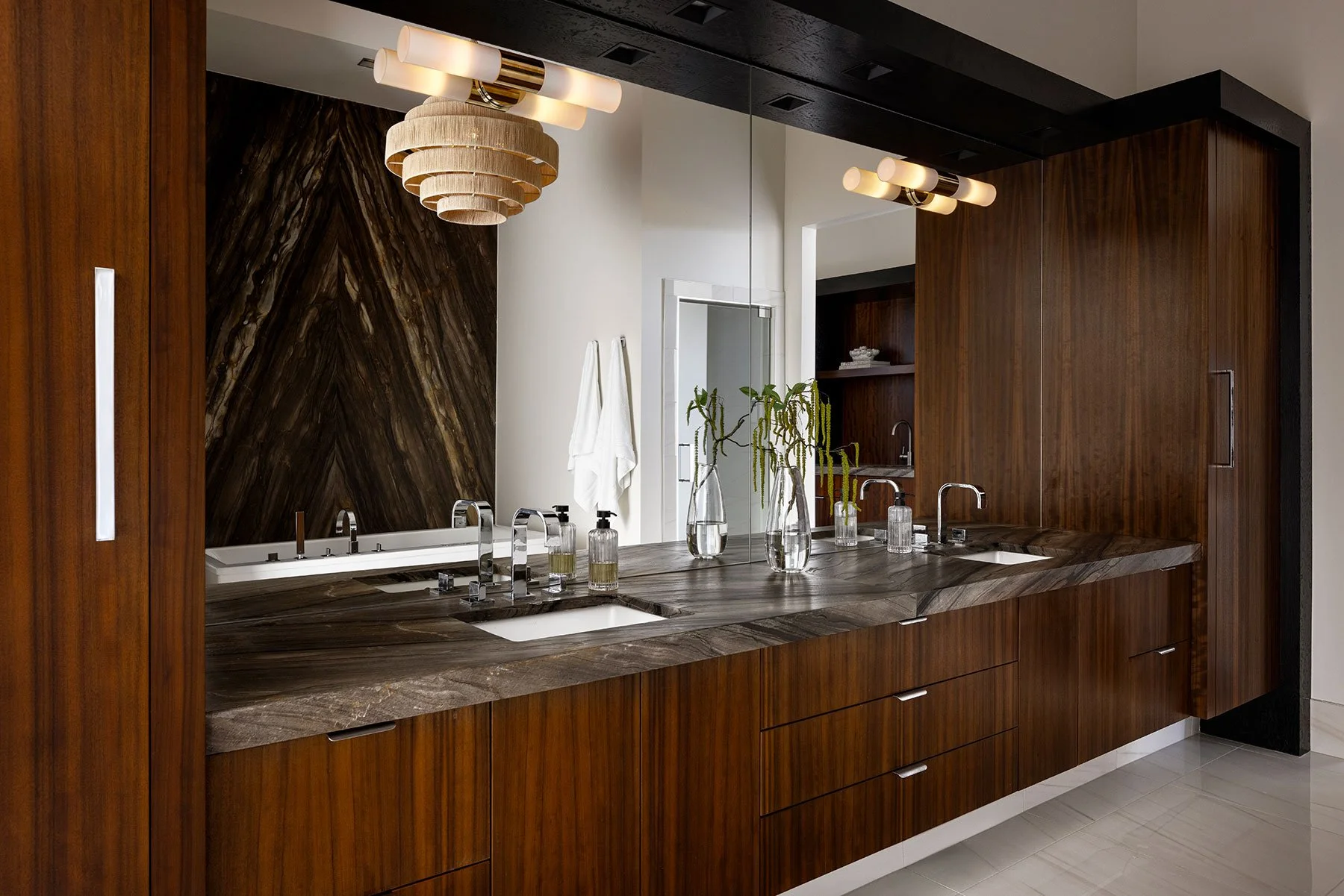 Our latest project transforms a sprawling new home, originally a blank white canvas with streamlined masculine undertones, into an inviting coastal retreat. Without extensive construction, we enriched the foundational aesthetic through creative space planning, accentuating the home’s openness with elegant, custom light fixtures and fluid coastal-inspired murals. Our design strikes a balance between classic and transitional, adding depth and warmth that evoke a sophisticated yet fluid atmosphere. The result is a harmonious blend of refined elegance (with a coastal kiss), perfectly tailored to the client’s vision of a timeless and welcoming space.